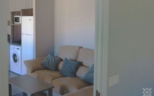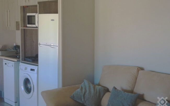Salón comedor con cocina equipada con TV, frigorífico, lavadora, lavavajillas y microondas.